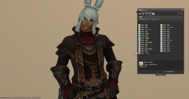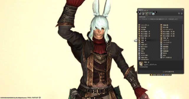 “エモート再生”から、好きなエモートアクションを選んで実行させられますよ。