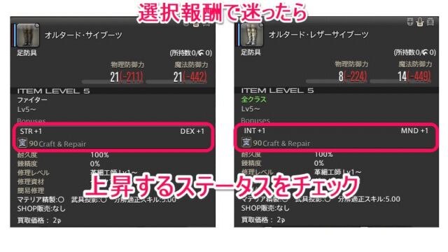 クエスト報酬などで、同じ部位・同じILの装備品が選択報酬になっている場合は、上昇するステータスから選ぶべき装備品を判断してください。