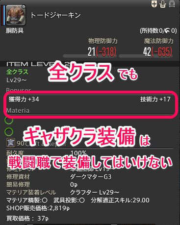 レベル50までの装備に多い「全クラス」向けのものですが、ギャザクラ以外にキャスターやヒーラーの装備が該当することもあります。