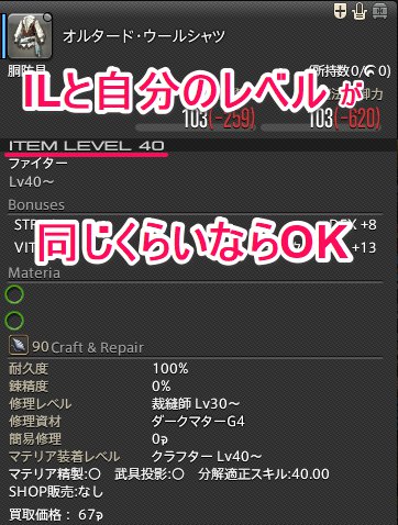 序盤(レベル50まで)の装備品の選び方は、自分のレベルとIL(アイテムレベル)が同等であることが目安になります。