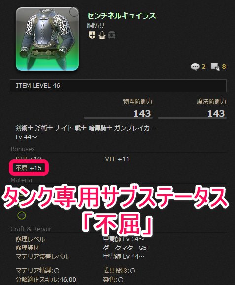 タンク向けの装備では、タンク専用サブステータス「不屈」が上昇するようになっているため、同等ILのファイター装備よりもタンク適正が高くなります。