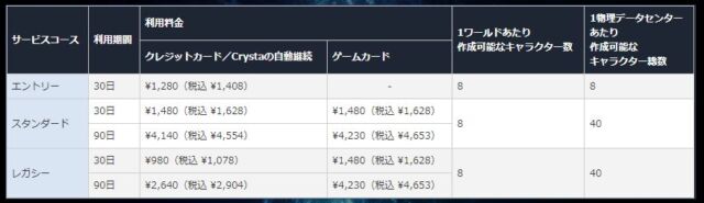1ワールドにつき8キャラまで作成できる「エントリー」プランと、1ワールドにつき40キャラ作成できる「スタンダード」プランがあり、30日単位か90日単位で支払い可能です。
