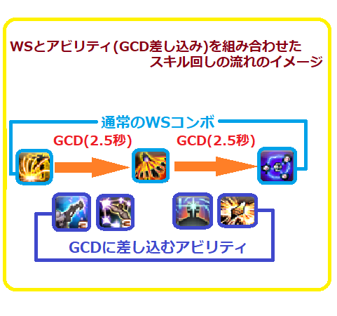 - GCD(グローバルクールダウン)…WSや魔法のアクション使用で発生する、共通の入力不可能タイム。アビリティは入力可能(一部例外あり)