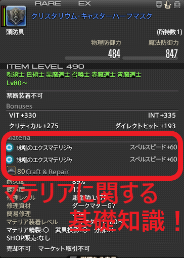装備品にセットする事で、攻撃力や回復力、ギャザクラのステータスを向上させられます。
