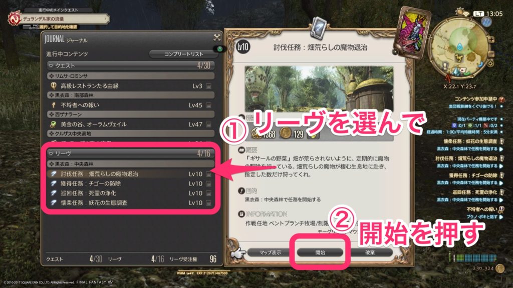 まずは最初のクエストを消化し解放しておき、順次リーヴをこなして経験値やギルを稼いでくださいね。