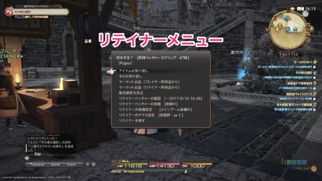 リテイナーを解放するには「リテイナーの冒険」をクリアしておく必要があります。リテイナーの冒険は、プレイヤーがレベル17になれば受注できます。