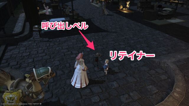 リテイナーベルは主に各都市のマーケット、ギャザクラクエストに関連するエリアのほか、宿屋にも置いてあります。