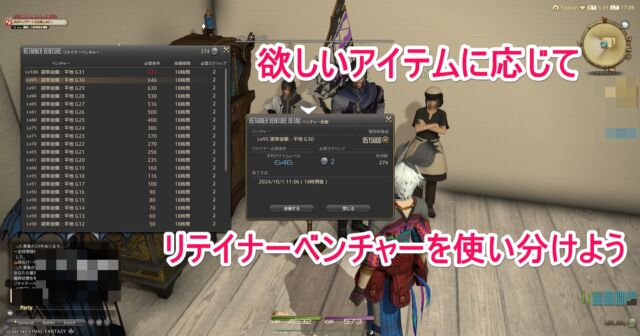 また定期的に装備を見直し、ILの底上げを図っておきましょう。装備品はリテイナーが帰還中にしか変えられないので、ベンチャー依頼前にチェックしてください。