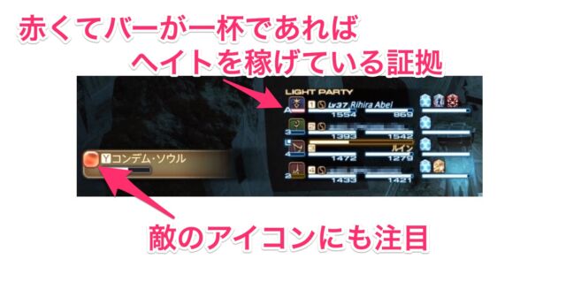 交戦中の敵は全て赤い□になるようヘイトを稼ぐのが基本です。
