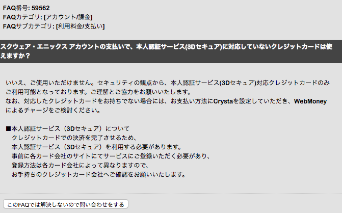 3Dセキュア未登録のカードは使用できないので注意してください(ただしFF14の月額サービス料金は未登録カードでも支払えました)。