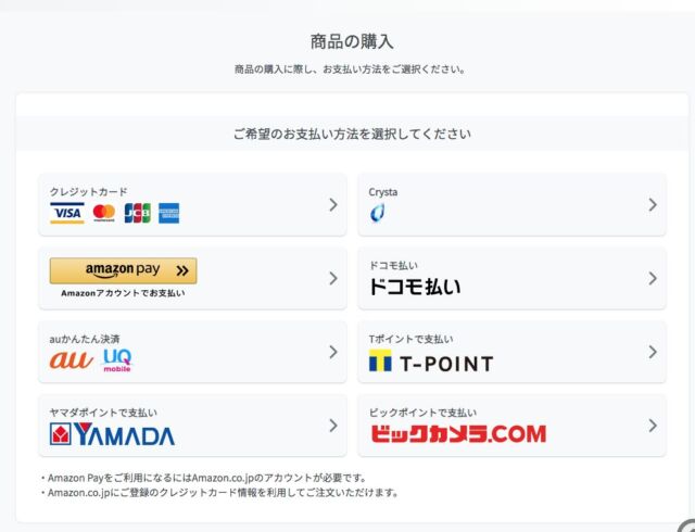 クレジットカード、Crysta、Amazon pay、ドコモ払い、auかんたん決済、Tポイント、YAMADAポイント、ビックポイントのいずれかが利用可能。
