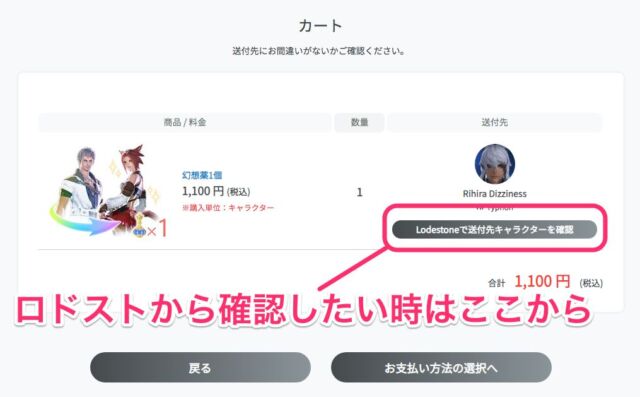 ロードストーンから送付先キャラクターを確認することも可能です。