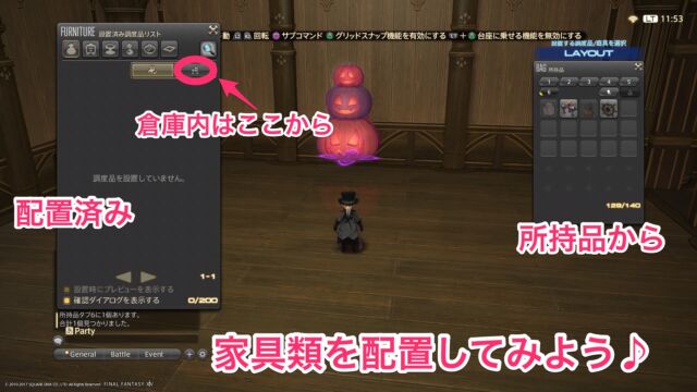 所持品メニューから直接配置するか、ハウジングメニューを開くことで倉庫に入っている家具の配置が行えます。