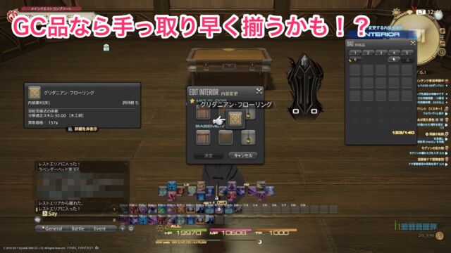 そんなときは、所属しているグランドカンパニー(GC)の事務局にて軍票交換を行えば、ある程度の家具を揃えられます。