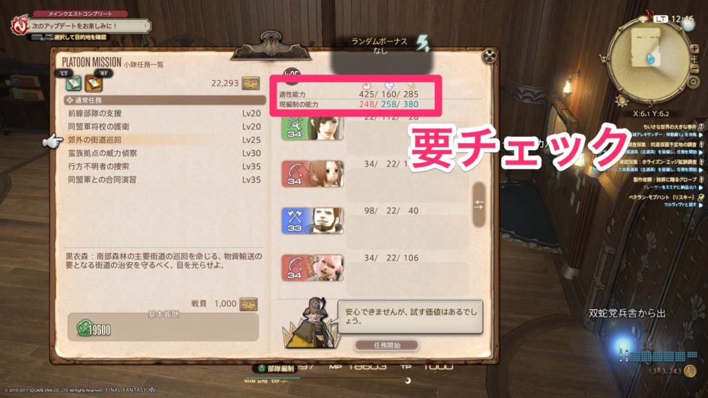 挑戦する際に任務ごとの適正能力と、現在の小隊総合能力が比較できるので確認しておきましょう。
