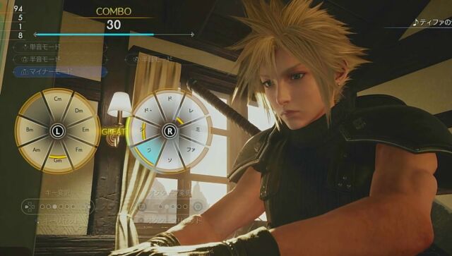 ティファの部屋では例のピアノ演奏ができましたよ。楽譜という収集要素があったので、ここ以外でも各地にピアノがあると思われます。演奏は、楽譜の指示に従ってLorRスティックを指定方向に倒す、というものでした。
