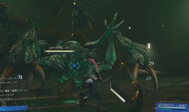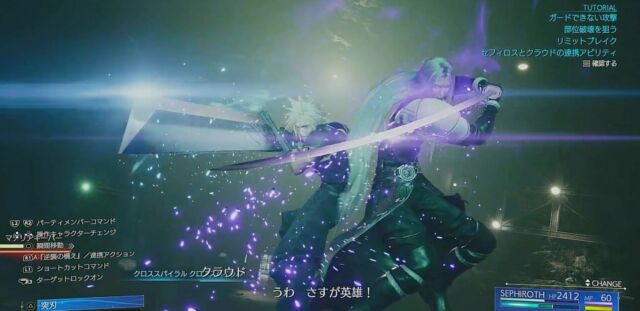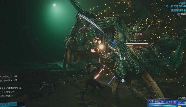 かねてよりアナウンスのあった「連携アビリティ」が実装されています。体験版ではクラウド・セフィロスの連携アビリティ発動によって、崖上に退避したマテリアキーパーを落下させることに成功しました。