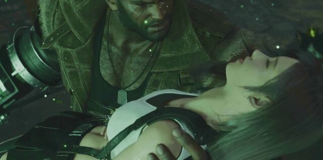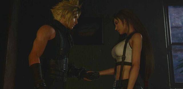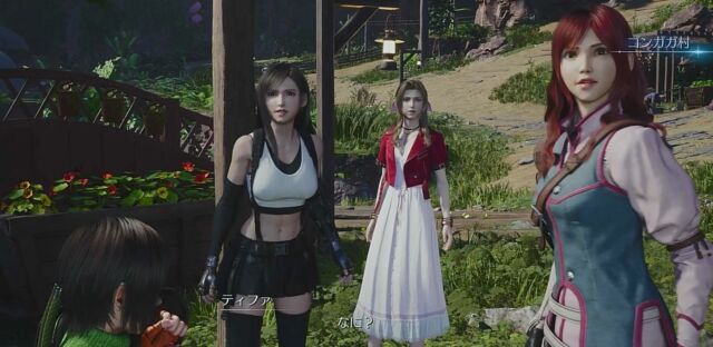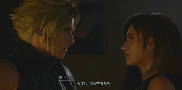 仲間たちの前にウェポンが登場し、ティファが帰ってきます。腑抜けのようになってしまったクラウドですが、なんとかみんなでティファを救出し、ゴンガガ村へ一旦退却。ここで、クラウドとティファのカットシーンです。