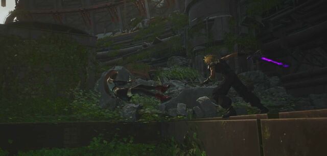 ボス戦後、いよいよウェポン登場。ここでクラウドの異変がピークになり、完全にセフィロスに乗っ取られた(剣の構えまでセフィロス)ようになります。そして、トレイラーで流れた、ティファに切りかかってしまうシーンへ。セフィロスに暗示をかけられた状態になり、ティファを魔晄炉へ落としてしまいました。