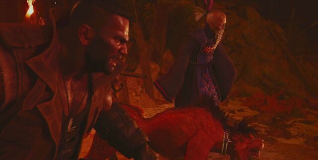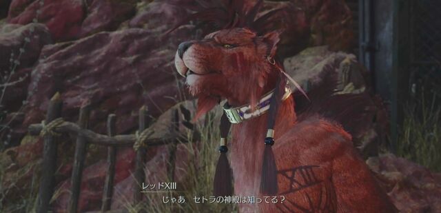 コスモキャニオンに到着すると、原作のとおりみんなの前で素に戻るレッドが可愛い~。これまで少しだけ、エアリスとの会話時には素に戻っていた様子が見られましたが、初見の人はここでようやくネタばらしという感じですね。