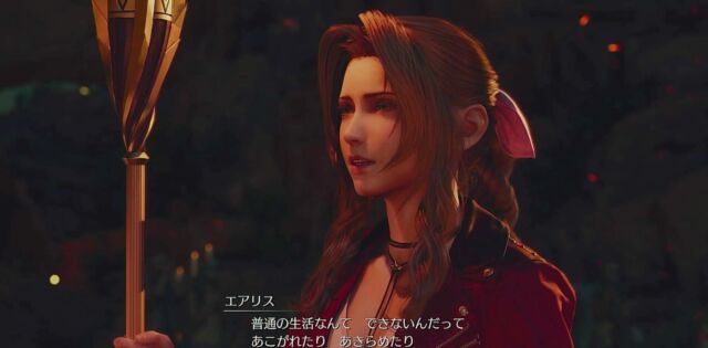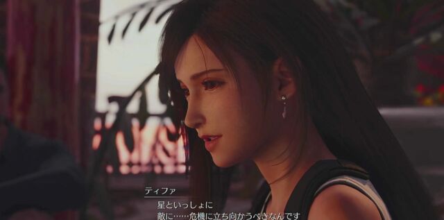 その後夜になり、コスモキャニオン名物?の「星送りの儀」のシーンへ。ここで仲間たちに話しかけることができ、エアリスに話しかけるとメインストーリーが進みますよ。大衆の前で自身の生い立ちや思いを打ち明けるエアリスをうまく励ましてあげましょう。