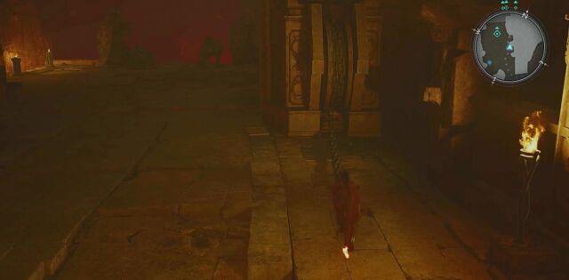 大きな門の前に来たら、そばにある鎖を引っ張って開けられますよ。鎖をものに引っ掛けないと門が閉まってしまうところもあるので、近くの杭に引っ掛けて固定します。杭がセットされていない場合は、近辺にあるので拾ってきて差し込めばOKです。