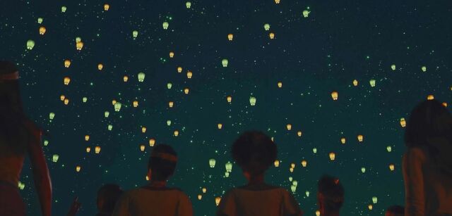 灯篭を空に放つと、炎の色がやがてライフストリーム色に。まるで星にかえっていく命の灯のようでした。