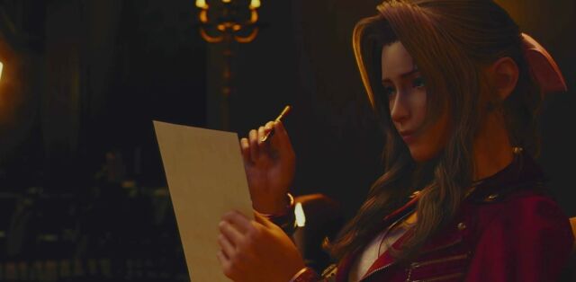 部屋に戻ろうとすると、紙とペンを持って悩まし気なエアリスに遭遇。なんと、本作の主題歌の作詞はエアリスという設定になっていました。これまた新しい。エアリス視点の歌であることがより伝わりやすい演出ですね。