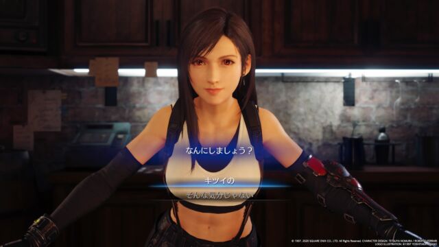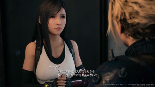 ティファにご飯を進められるクラウドですが、報酬が先。