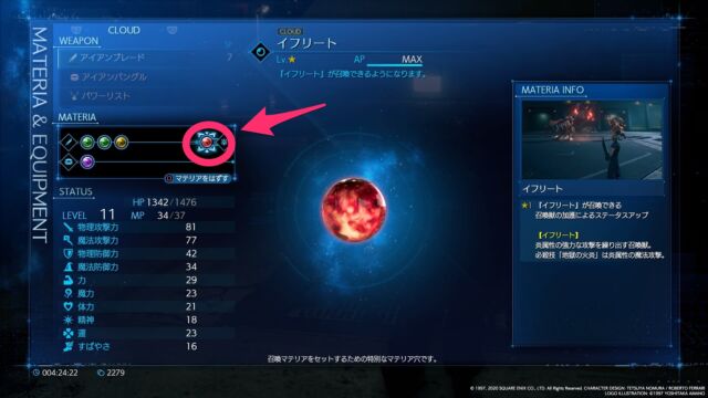 ジェシーにもらった召喚マテリアは、召喚マテリア穴にのみ装着できるので要注意。