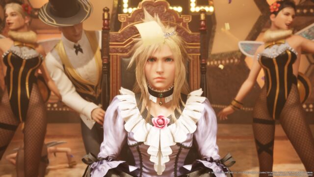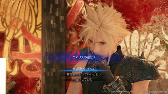 エアリスが着替えに入ったあと、サムかマムに依頼されるサブクエの消化率でクラウドのドレスが決まるようです。全て消化しなかった場合、黒の落ち着いたワンピースになりました(1消化でも黒ワンピ)。