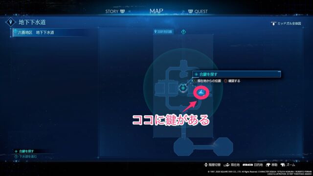 鍵はマップ右側の中央水路、ここで排水し、下の足場に落ちています。中央スタンプが目印。