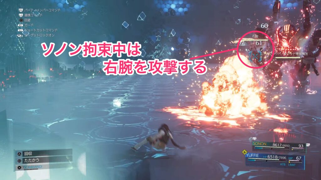 すぐにソノンが拘束されるため、できるだけ腕を狙って拘束を解きます。