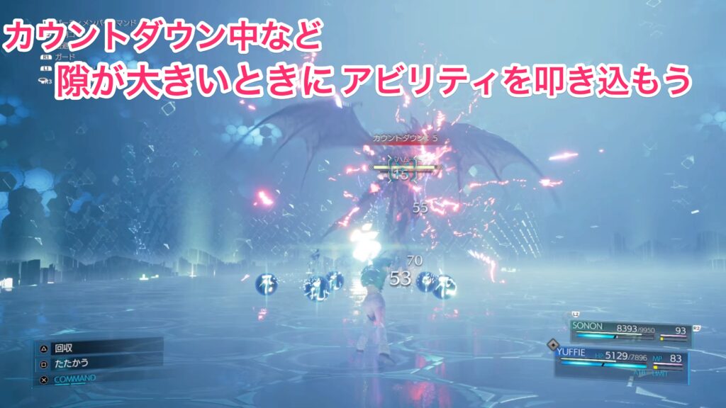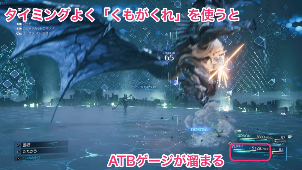 ユフィはATBゲージを常に1維持することで、どの攻撃もくもがくれで回避可能です。