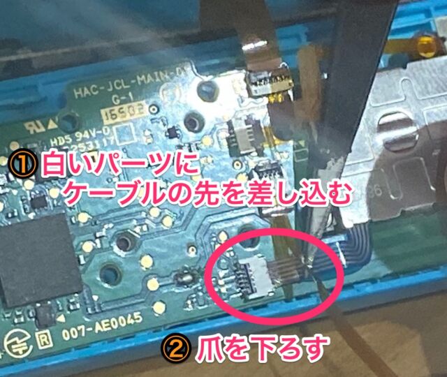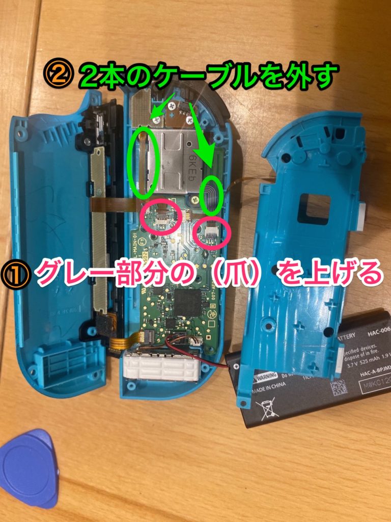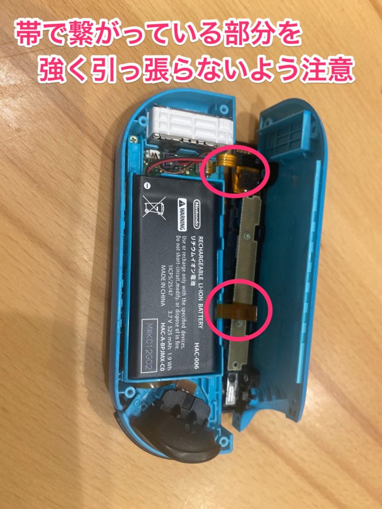 スティック部分の周辺にある、2本の帯ケーブルを外していきます。