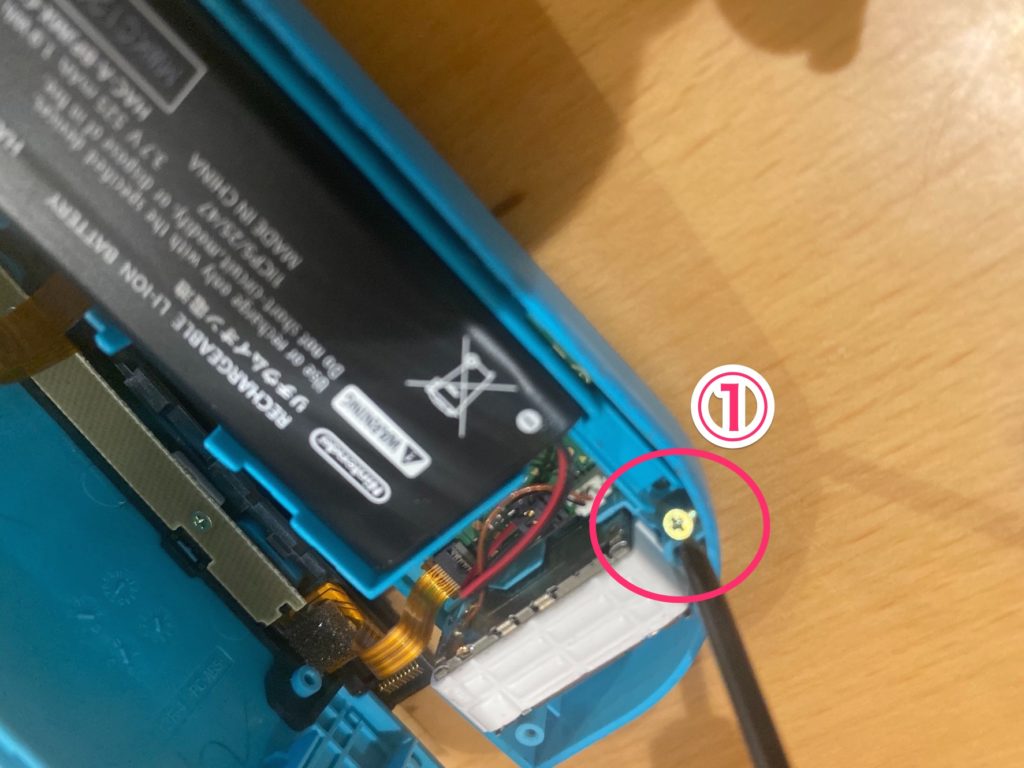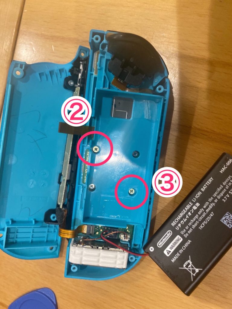 バッテリーのあった部分に2つのネジ、ジョイコン下側に1つネジがあって、この3つを外すと内カバーを取ることができますよ(画像の①〜③のネジ)。