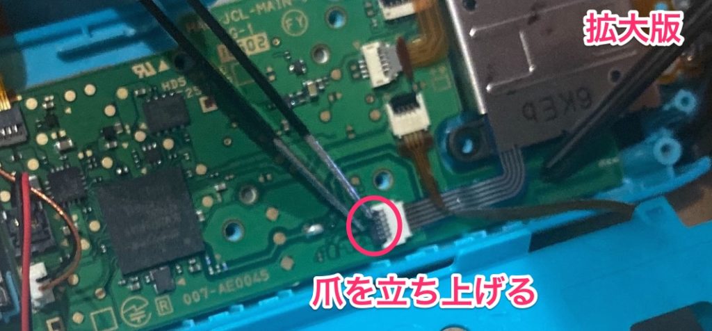 爪が上がると、そこに繋がっていたケーブル(緑の◯の部分)を少し動かすだけで外すことができます。