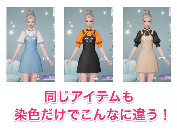 入手したアイテムは「染色」メニューから、色の変更が行えますよ。
