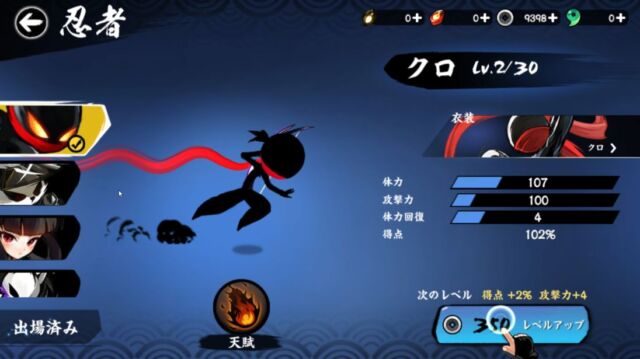 彼ももちろん育成ができ、忍銭を消費して体力や攻撃力を高めていけますよ。