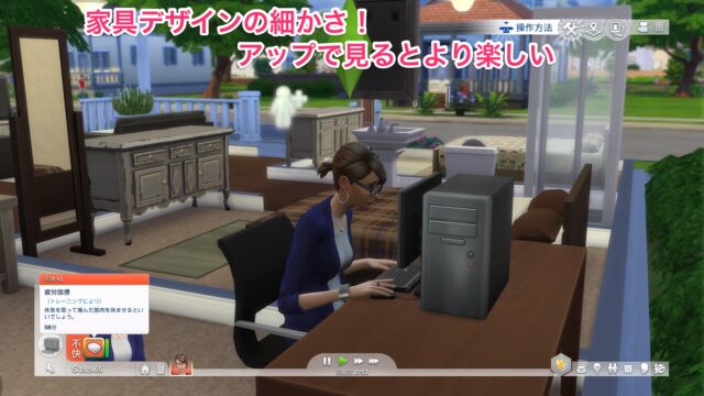 基本的には勝手に行動しますが、自分の思うようなシムに育てたいなら、仕事をさせる、料理をさせるといった誘導が欠かせません。