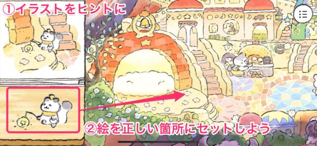 左上に表示されたイラストをヒントに、その下にある絵を全体イラストの中にセットしましょう。