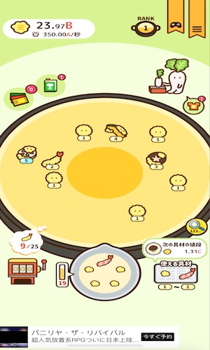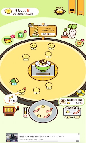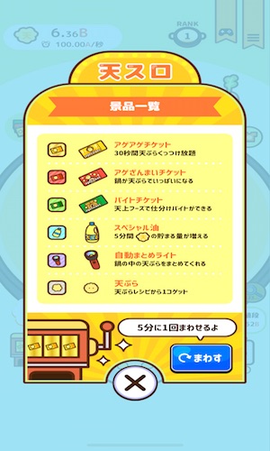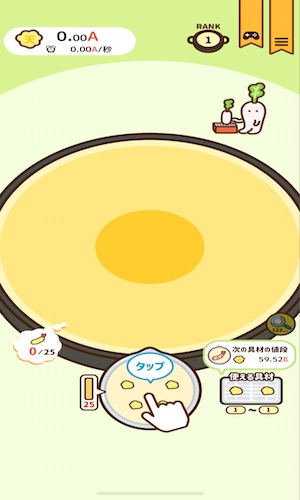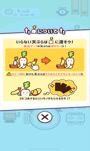 天ぷらを作る→アゲポイントを貯める→上位具材を開放して天ぷら作製効率を上げる、これらの繰り返しでランクアップを目指しましょう。