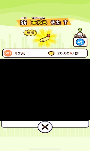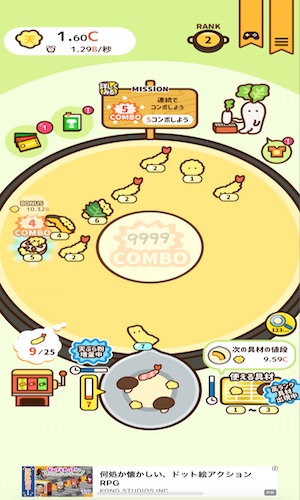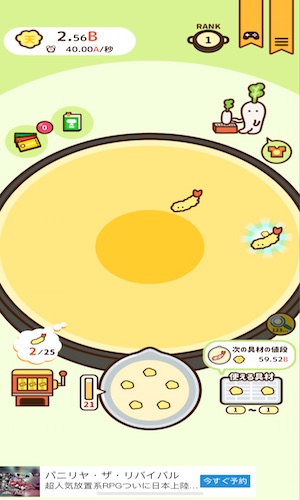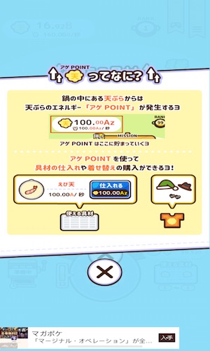 お鍋に入っている最高ランクの天ぷらの能力に応じて、放置で増える「アゲポイント」が上昇。