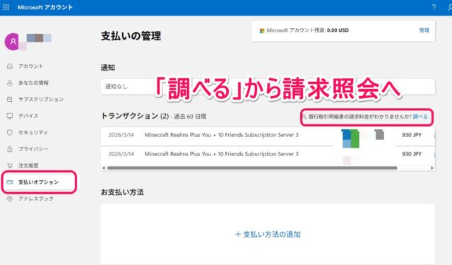 まずはMicrosoftアカウントの支払いオプションから、カード情報による支払照会を試してみてください。