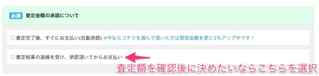 いくらでも良いから売りたいならチェックを入れても問題ありませんが、金額を確認してから考えたい場合は、その下の“査定結果の連絡を受け、承認頂いてからお支払い”を選んでおきましょう。