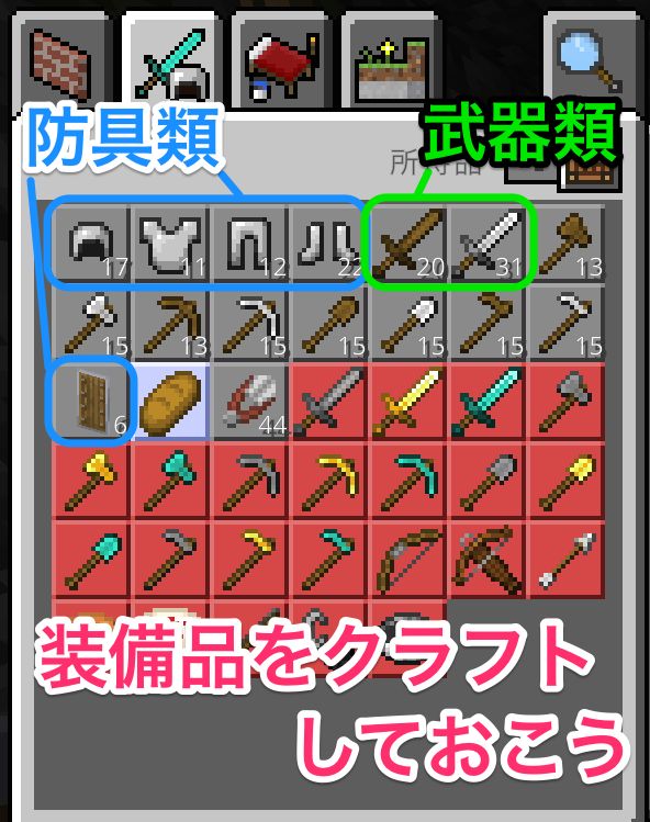 鉄を生成したら、鉄の剣と鉄シリーズの防具を作りましょう。