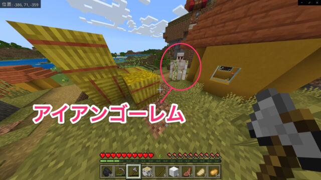 村にスポーンしている“アイアンゴーレム”は、攻撃すると襲ってくるので要注意。