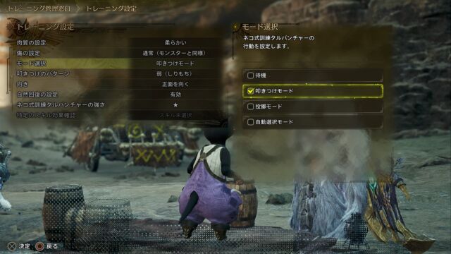 トレーニングエリアでは、ルークに話しかけてタルバンチャーの設定を変えておきましょう。「モード選択→叩きつけモード」で練習します。