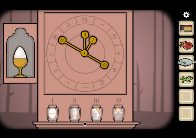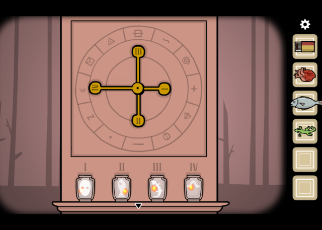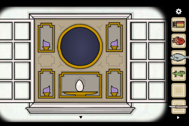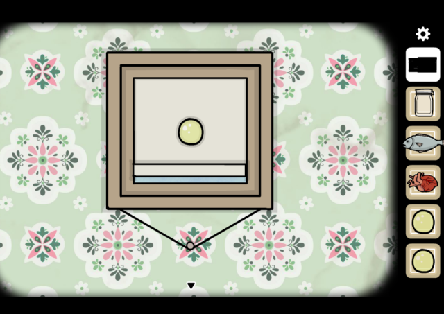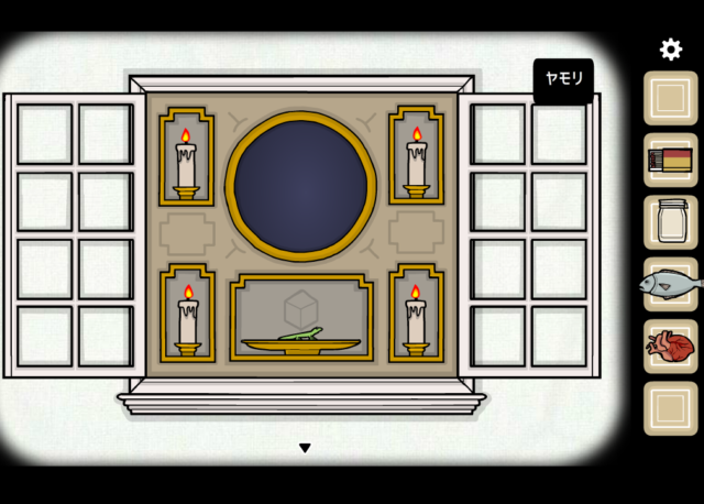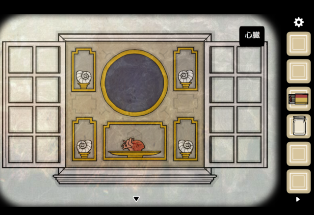 窓の部屋へ。4つの小皿にビー玉を起き、中央の大皿に心臓を乗せて別空間へ