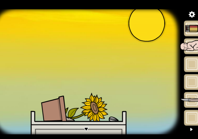 そばにある太陽を上にドラッグし、さらに右へドラッグしてヒマワリを引っ張って植木鉢を倒す。